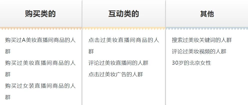 我们可以判断,购买类的用户把握度是最高的,而互动类的人群比购买类会差一点。一般来说,私域数据的把握度大于公域数据,行为类定向的把握度大于属性类定向,核心类目的把握度大于关联类目。这些千川投放要诀你一定要把握好。