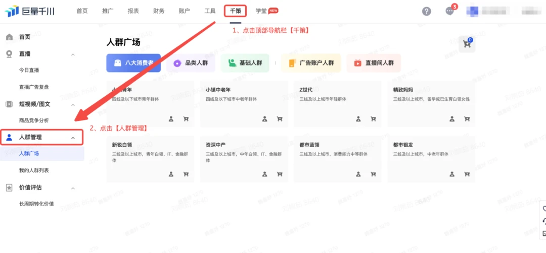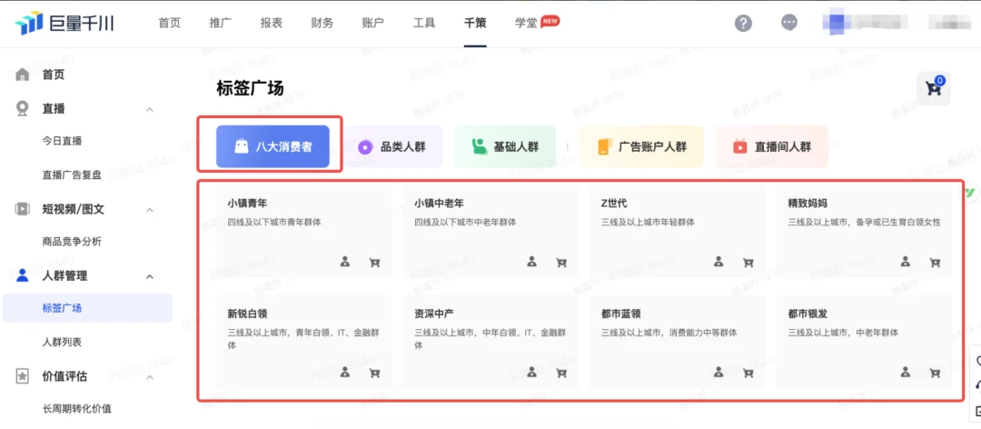 巨量千川【人群管理】包含标签广场、人群列表,能帮助商家的计划精准跑量,不浪费每一分预算。标签广场覆盖全面电商维度,包含八大消费人群,基础人群及丰富的品类人群标签,商家可以配合电商场景对人群标签进行交集、并集以及排除圈选。