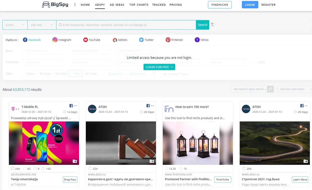 第二个工具: bigspy。 这是一个广告窥探工具,有免费版本,但是有限制,看了看到相关的广告数据。 在页面内输入关键字,广告主名称,或者域名都可以找到正在投放的广告。免费版本有次数限制,但是作为一般的广告主来说,已经足够使用。