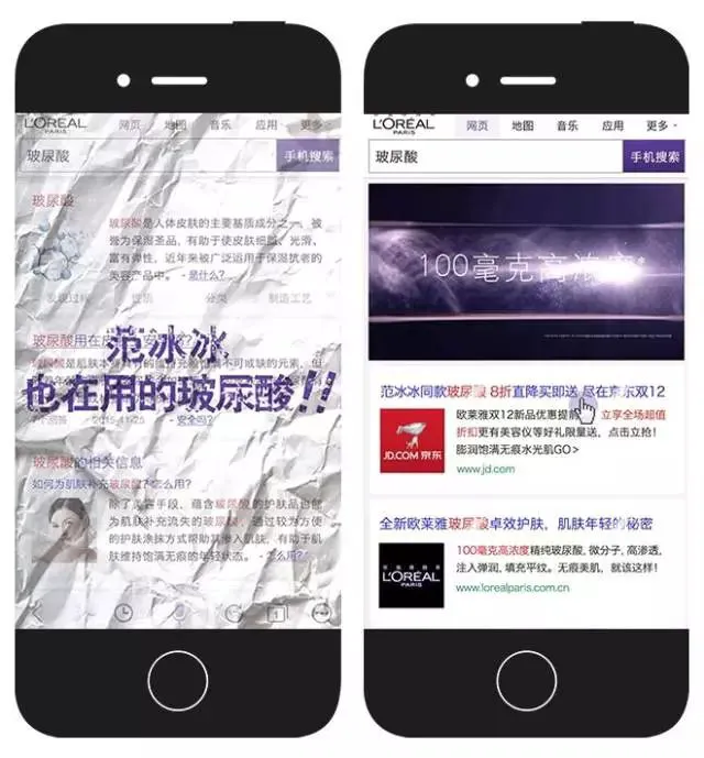 强调纯天然不整容的「范冰冰」和「玻尿酸」本身就极具话题性,于是欧莱雅巧妙利用这个话题投放八卦的朋友圈——“范冰冰到底脸上用了什么?”。同时,通过模拟搜索的创意H5,将消费者自然引导到京东购买页。