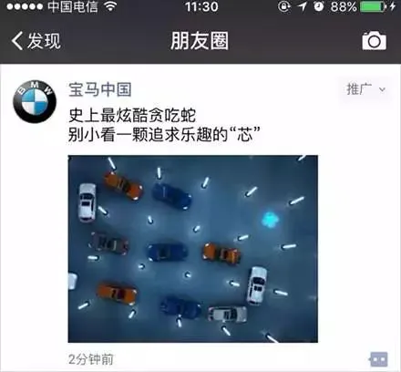 第一个吃螃蟹的宝马,第一次的广告是一句话,一个H5 的超链接,几张图片,传达其「悦」的品牌形象,强化「悦」的概念,如驾驶时的愉悦等。后期另制作的朋友圈广告还是蛮有意思,通过一个贪吃蛇游戏完美展现宝马汽车的优质性能。