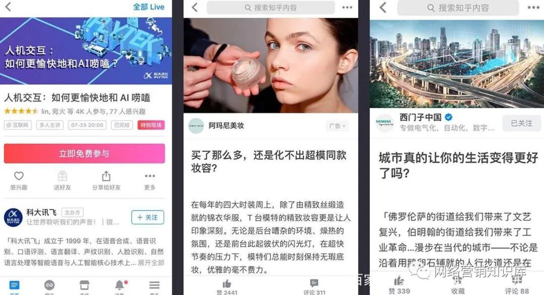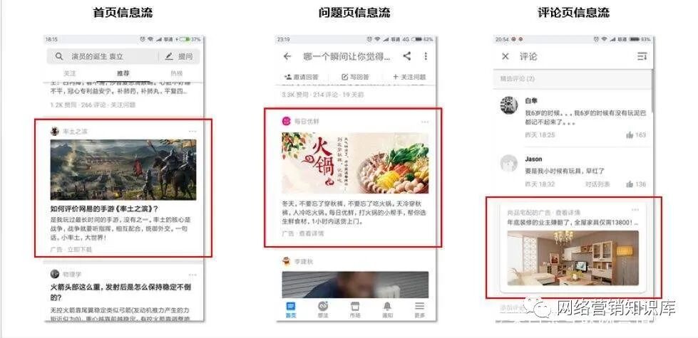 知乎通过推荐页、问题页、回答页、关注页向用户推送信息流广告。用户群体以白领、高收入、高学历为主。知乎是网络问答社区,连接各行各业的用户。用户分享着彼此的知识、经验和见解,为中文互联网源源不断地提供多种多样的信息。知乎的创意主要分为:大图、文字、视频、小图、组图。