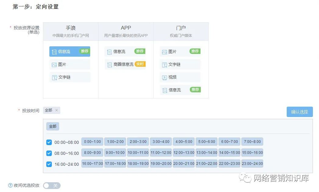 在信息流的后台可以通过人群画像、兴趣爱好、职业、关键词等选择受众群体。在没有推广数据作对比的情况下,投放广告定向不宜过窄,定太窄达不到平台消费水准,就会刻意缩减你的展现,在兴趣定向上,不要过于精细。新账户投放通过对受众人群的初步分析,先确定一个大概的人群定向,逐步投放,慢慢优化,最后做到精准营销。