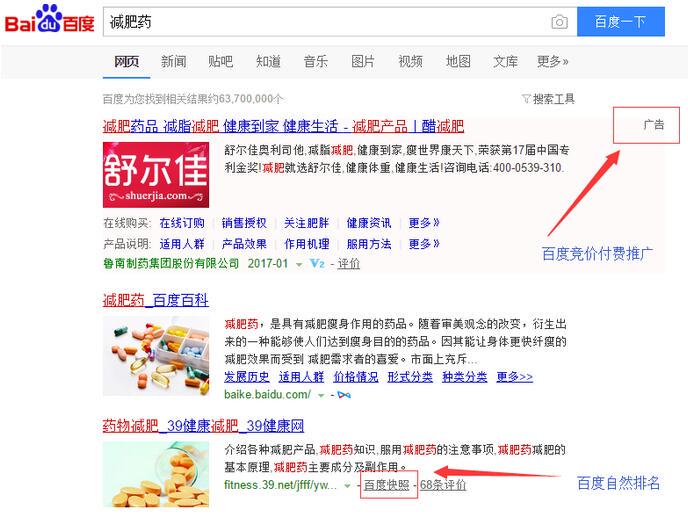 竞价就是花钱在搜索引擎上买广告位。例如,用百度搜索“减肥药”,结果如图所示,排名在前的网站与排名在后的网站有什么区别呢?搜索结果里,排名在前的网站后面有“广告”两个字,而排名在后的网站,从网站“百度百科”开始,就没有“广告”两个字了,自然搜索排名的是网站后面有“百度快照”字样。