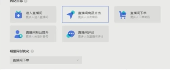 当你选择:进入直播间、直播间商品点击的时候,下方会有一个【期望同时转化】,你可以进行选择同时优化“直播间下单”,这就相当于你在优化直播间商品点击,或者吸引来更多的人的同时,又可以保证下单数。