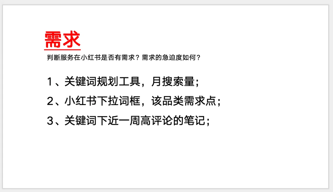 在判断用户需求,可通过关键词规划工具、小红书下拉词框和近一周高评论笔记;