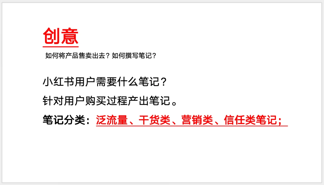 创意是对产品和服务展示,也就是小红书笔记板块。创意本质就是销售,关注销售层面。