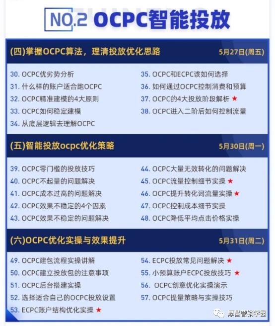 课程中针对OCPC板块进行了重大更新,内容扩充到了30余个竞价推广OCPC的常见问题与玩法,对于竞价推广OCPC的常见问题几乎做了100%的全面覆盖。