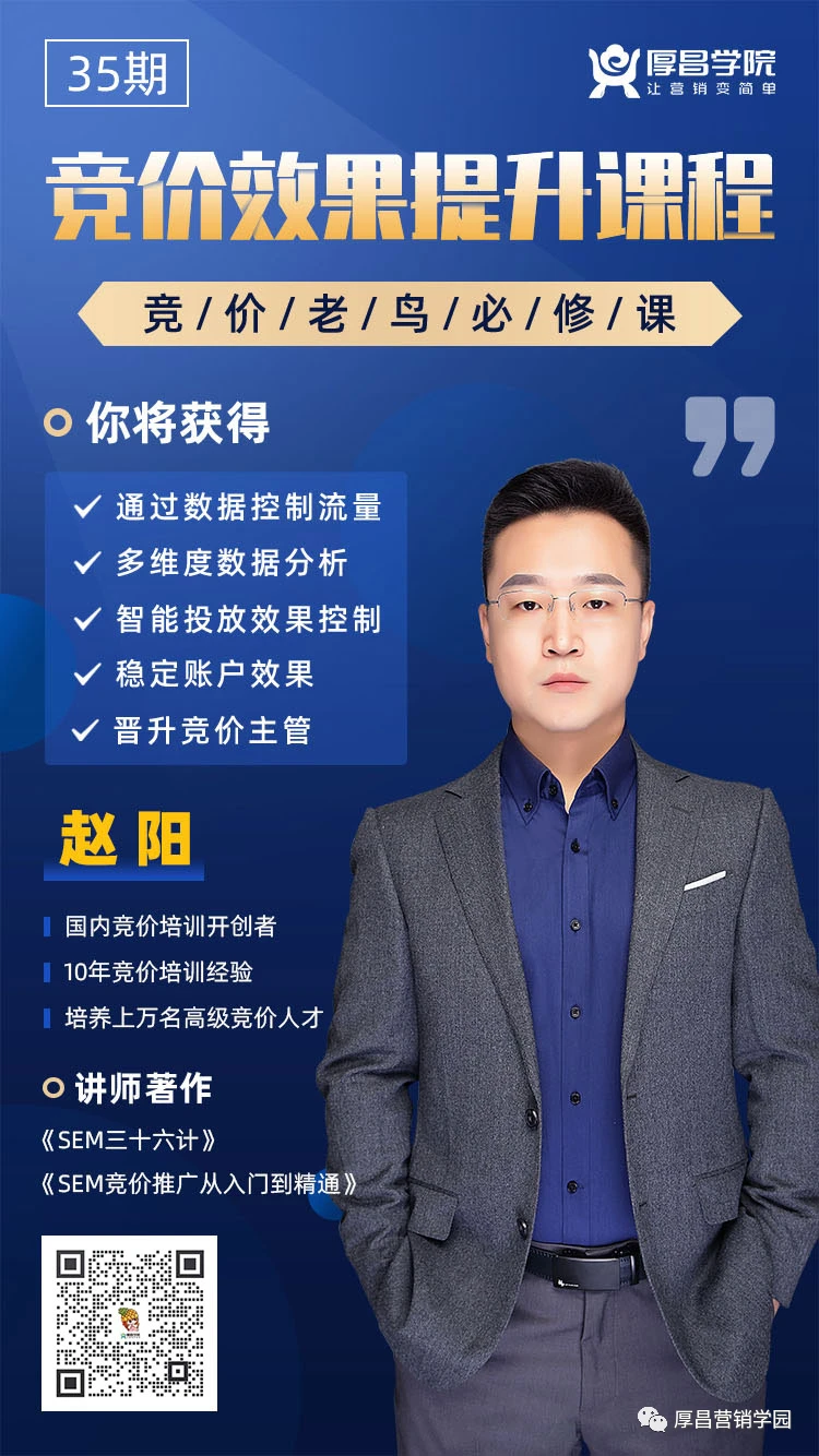 第35期《竞价效果提升课程》即将开课,现在学习可以提前享受赵阳老师的专业指导。