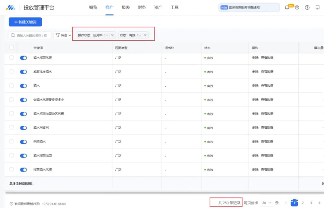 ①进入账户点击上方导航栏推广-广告-关键词,查看关键词模块,筛选有效状态关键词,下拉至底部查看关键词数量;