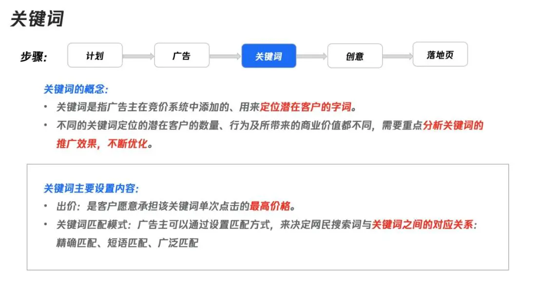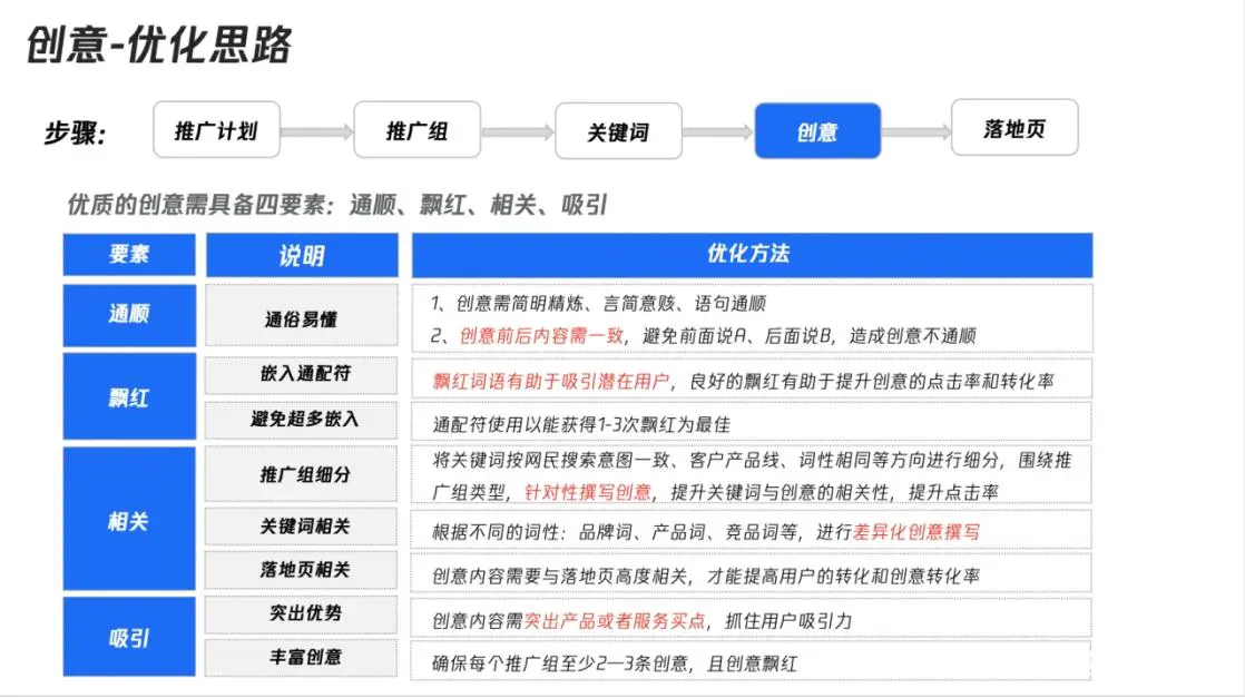 广告设置环节:账户物料设置需经历从“关键词定向一创意-出价一 转化“四大步骤。
