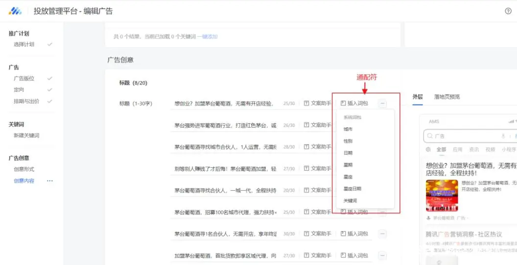 ①添加关键词通配符:可以在创意中插入通配符,这样可以实现不同的关键词与创意的多种匹配,广告展现时,将触发的关键词替换到通配符内展现。通配符可以给创意带来更高的点击率,促进质量和推广效果的提升,插入通配符可获得更多飘红来吸引网民关注;