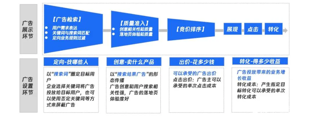 广告展示环节:前端广告展现需经历从“厂告检索-质量准入-竞价排序-展现、点击、转化"四大步骤。