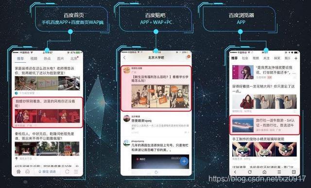 百度信息流广告,就是穿插展现于百度信息流中的原生广告,充分整合百度首页(手机百度APP+百度首页WAP端)、百度贴吧(APP+WAP+PC)、百度浏览器(APP)三大资源,主要以单图、大图、三图、视频等样式展现在原生资讯内容之中,利用百度强大的定向技术,为广告主提供的一个优质的营销平台。使用户在浏览内容时不自觉地去接受广告信息,保留了固有的用户体验。