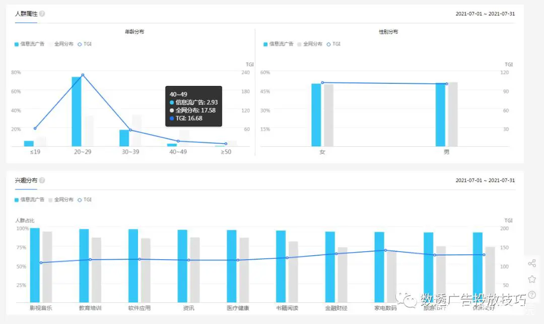 百度信息流的第2个定向是兴趣。兴趣可以重点参考百度指数。如图,这是关键词“信息流广告”的用户画像。
