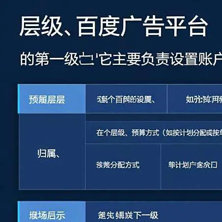 账户层级是百度广告平台的第一级,它主要负责设置账户的整体属性和预算分配。在这个层级,用户可以定义账户的归属、预算分配方式(如按计划分配或按单元分配)等。计划层级是账户的下一级,它主要负责创建广告计划,选择投放目标(如推广网站、推广应用、推广店铺等)、设置预算和投放时间等。每个广告计划可以包含多个广告单元,每个广告单元又可以包含多个广告。