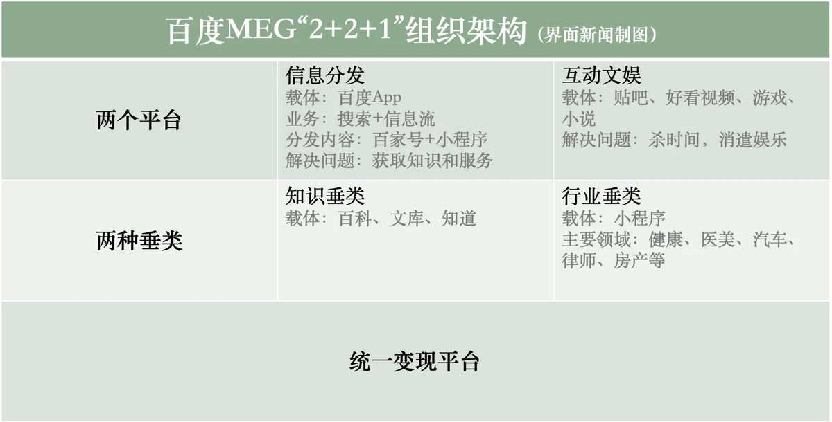 沈抖统一了用户产品、商业产品和销售体系,把移动生态业务划分为“2+2+1”的模式,即两个平台、两种垂类和一个变现平台。两个平台是信息分发和互动文娱,两种垂类是知识垂类和行业垂类,这些产品都由统一的变现平台进行商业化。