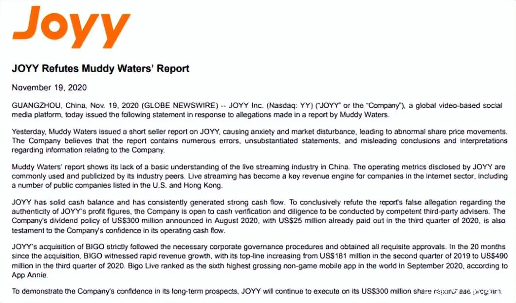 欢聚时代也做出回应,称浑水公司对直播行业根本不了解,公司可以提供海内外现金余额和银行存款对账单供第三方做现金确认。