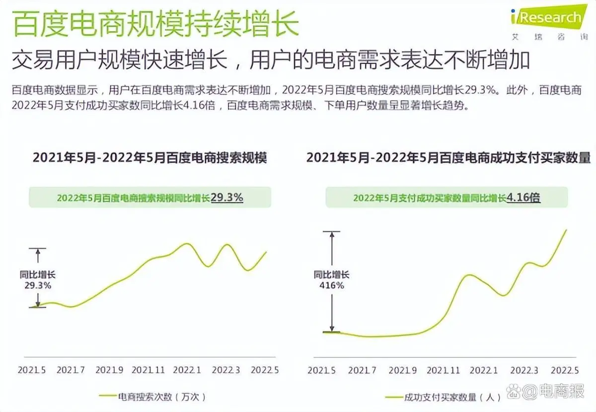 数据显示,2021年5月-2022年5月,百度电商搜索规模同比增长29.3%,支付成功买家数同比增长4.16倍,需求规模、下单用户数量均呈现出显著增长的趋势。