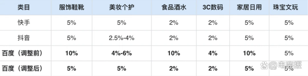 其中,服饰鞋靴、美妆个护、家居日用、珠宝文玩等类目的佣金下调至5%,食品酒水、3C数码类目佣金下调至2%,年度环比下降范围达到50%-80%。