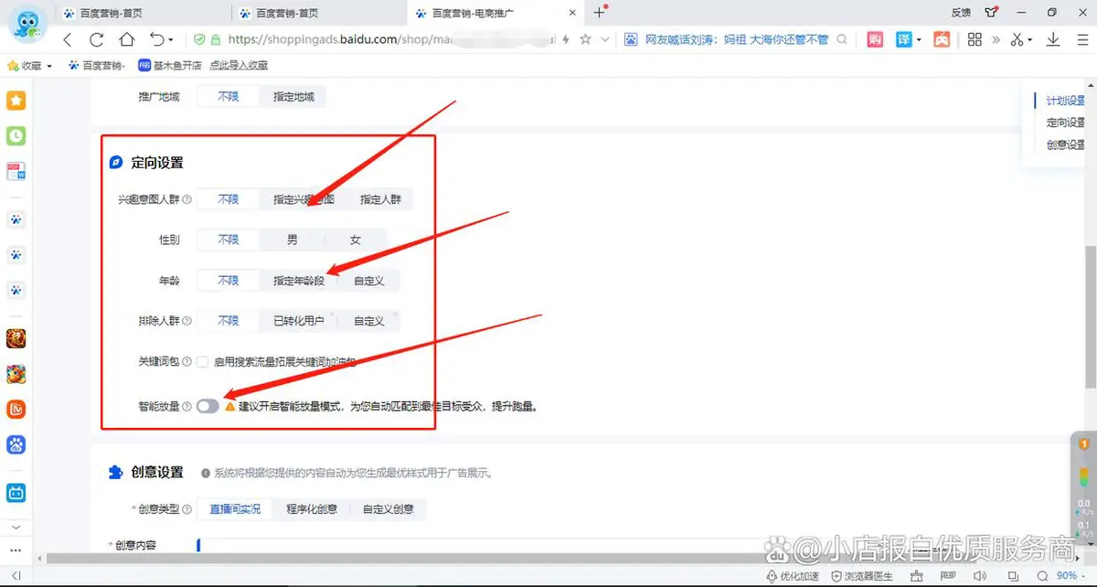第七步:百度直播推流定向设置,可以指定兴趣意图设置,也可以指定人群设置,根据你直播行业类型,选择你行业客户群体即可。