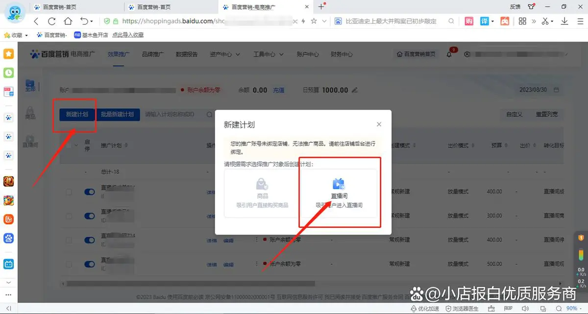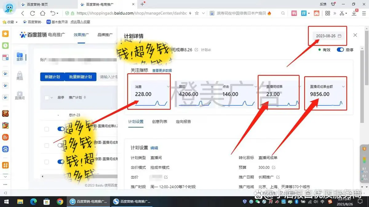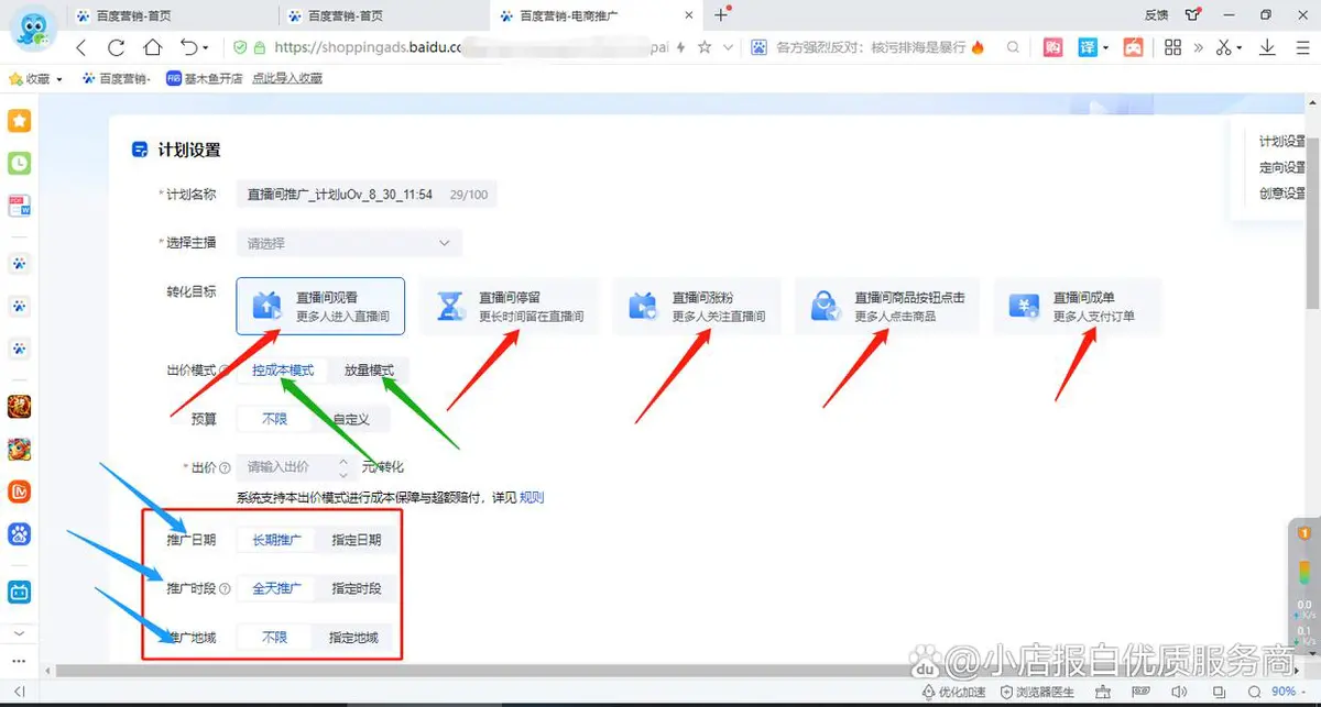 第六步:开始创建计划,这时候百度直播推流有五种推流方式,直播间观看,直播间停留,直播间涨粉,直播间商品按钮和直播间成单,选择你想要的推流模式即可,设置好推流日期和时间和地域和预算,出价模式控成本和放量根据情况设置。