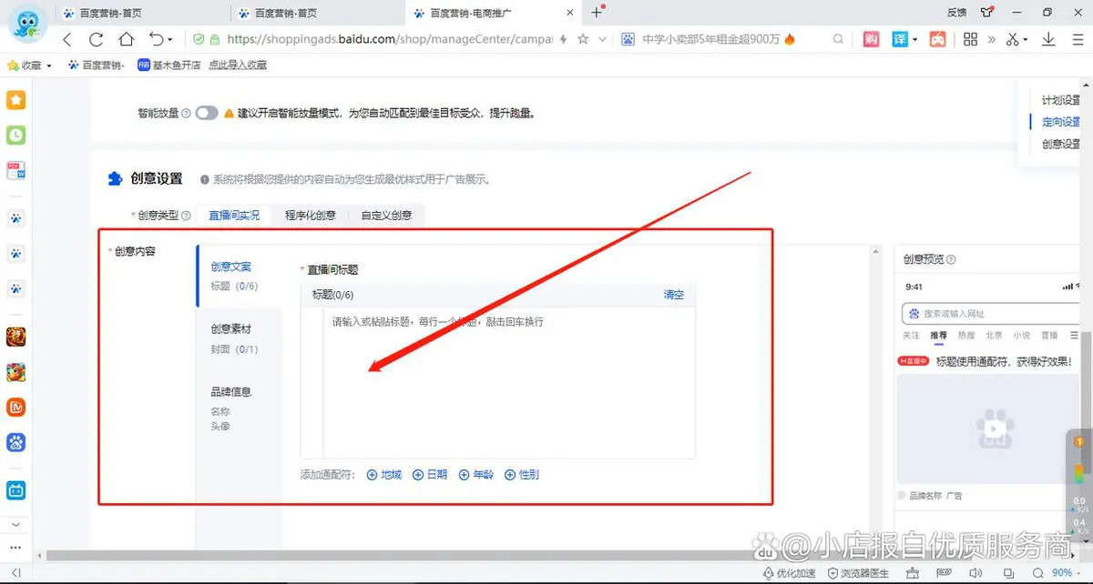 第八步:百度直播推流创意设置:设置好创意的标题,封面,还有品牌信息即可,这个比较重要,所以创意需要新颖,能吸引到客户点击广告进入直播间,创意设置好点击提交,然后这样一个百度推流计划就搭建好了。