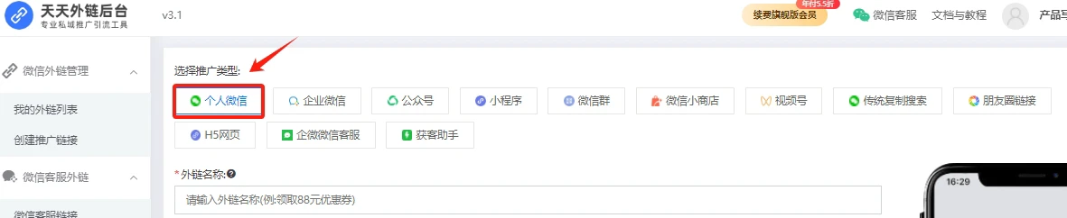 第二、进入控制后台,选择推广合适的类型比如:个人微信,工具页面提示,填写相应的参数,点击“创建推广链接”