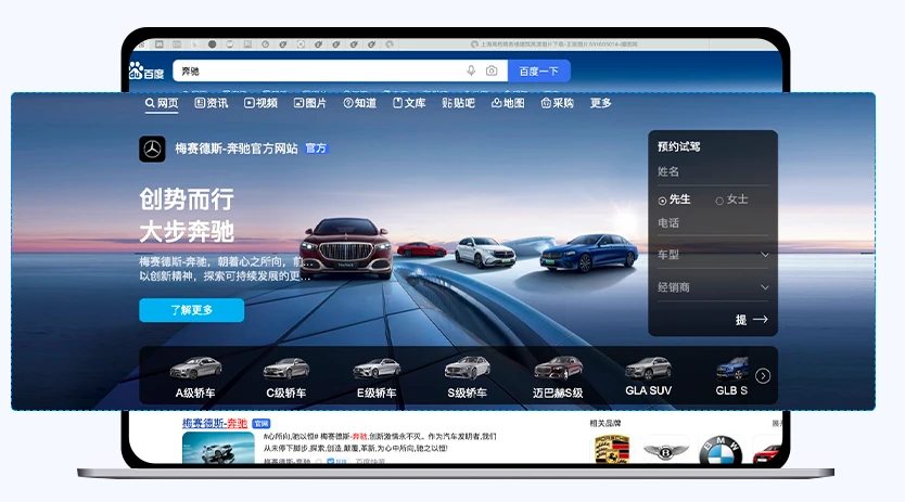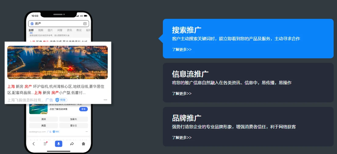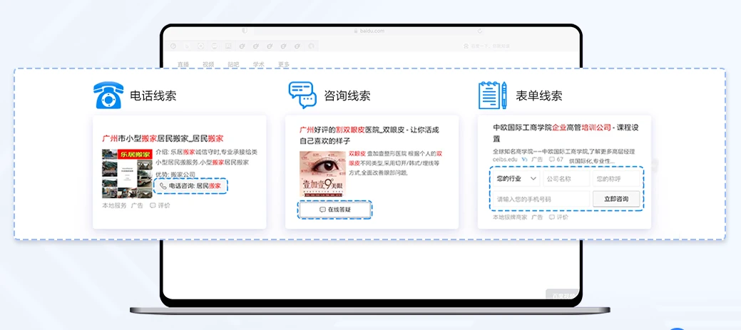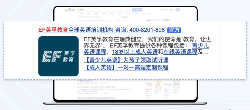 客户主动搜索关键词时,能立即看到您的产品及服务,主动寻求合作。搜索推广是基于中文搜索引擎百度搜索