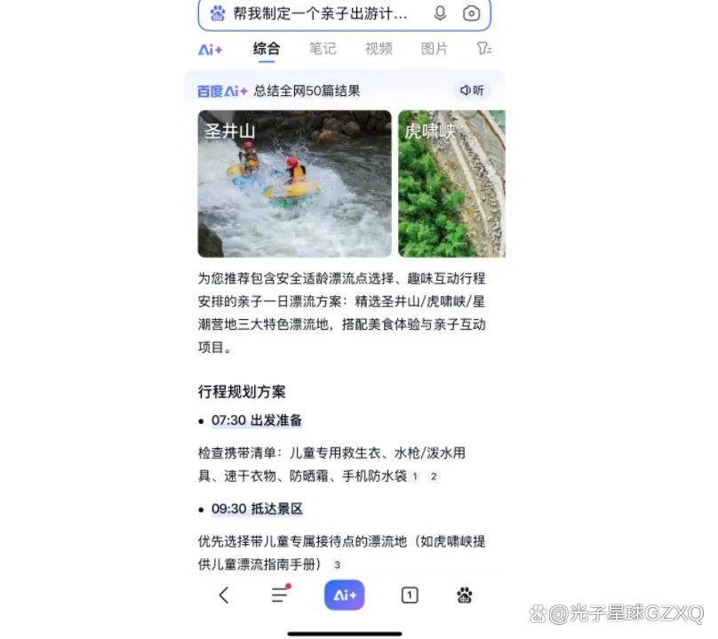 “大”从表面看是搜索框所能承载的内容和能调用的工具变多。例如,过去做旅行计划得靠“亲子出游”“漂流”“一天”等关键词堆砌,现在只要用自然语言提需求即可。