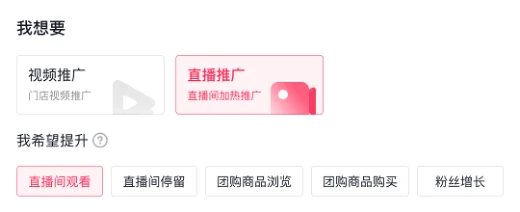推广直播的优化目标:直播间观看、直播间停留、商品点击、商品购买、粉丝增长