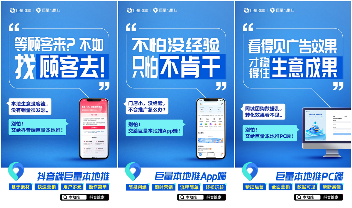 基于本地商家人力少、没经验、效率低、太复杂等推广难题,巨量本地推整合内部资源继App端、PC端上线后,抖音端巨量本地推也即将上线,抖音端巨量本地推将直接嵌入抖音页面,拥有抖音搜索、短视频分享页、直播分享页和个人中心页4个入口,用户可基于内容素材,在抖音直接进行门店与团购商品的推广,增加门店客流,提升团购商品销量。