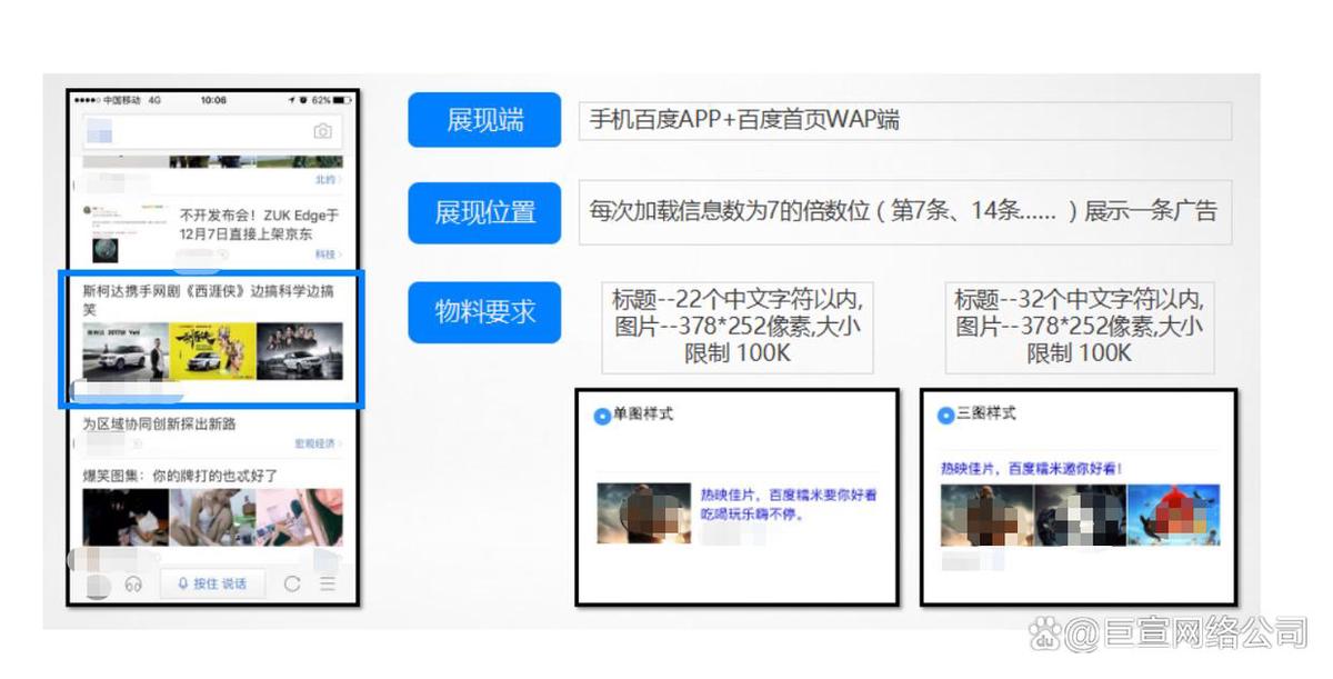 百度信息流广告的展现方式多样,包括文字、图片、视频等多种形式,能够满足不同广告主的需求。其中,图片和视频广告的视觉效果较强,能够吸引用户的注意力,提高点击率。文字广告则更加注重内容的创意和吸引力。