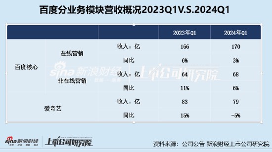 但难容乐观的是,百度的各个业务模块增长势头均较为一般,且增速均较2023年Q1下滑。其中,在线营销的同比增速由2023年Q1的6%下降至3%,非在线营销的同比增速由11%下降至6%;爱奇艺的同比增速由2023年Q1的15%下降至-5%。