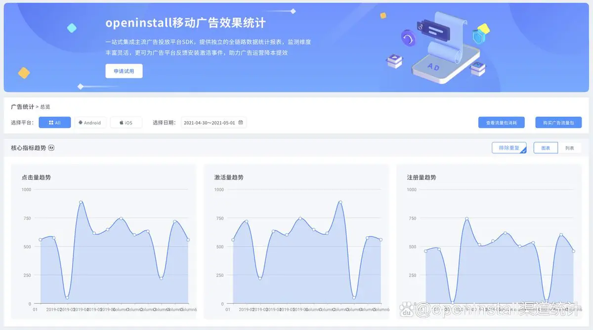 可以通过openinstall等第三方广告效果监测平台一站式对接所有广告平台,进行数据归因和效果分析,并实现oCPX类深度数据回传,让广告自动优化出价模型,实现更精准、更低成本的投放效果。
