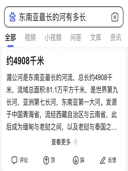 如下图所示,我们问一个河流的长度,搜索结果精确返回了河流的长度,而不是返回有答案信息的网页链接让用户依次查找。能做到这样,是深度学习起着至关重要的作用,模型从语料中寻找、判断、截取准确答案,然后呈现给用户。此外,用户还能输入图片并询问图片的内容是什么。