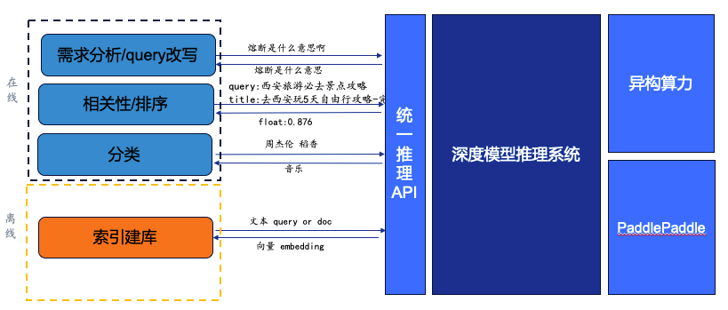 语义检索通路主要包括离线通路(下图左侧)和在线通路(下图右侧)。我们可以看到无论是离线还是在线,都用到了深度学习模型ERNIE。