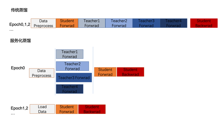 在实际业务场景中,随着teacher数量不断增长,蒸馏过程无法并行,teacher模型前向推理是串行的且耗时占比会越来越高,成为主要瓶颈。所以从工程师的视角,我们将 teacher放在异构的算力上去推理,一方面将串行的teacher前向推理并行化,另一方面可以将闲置的资源利用起来,如下图所示,整体加速蒸馏效率。