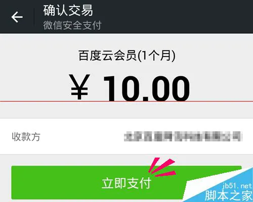 6、扫一扫完成后跳转为付款确认页面,请在付款前确认一下金额是否与网页一致,确认开通的时间与付款金额相符,点击[立即付款],输入[支付密码]就能完成支付