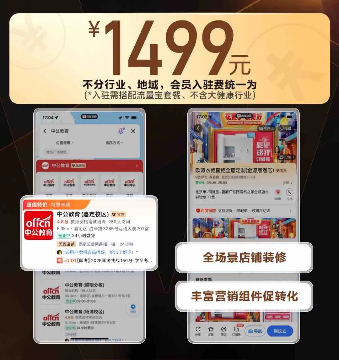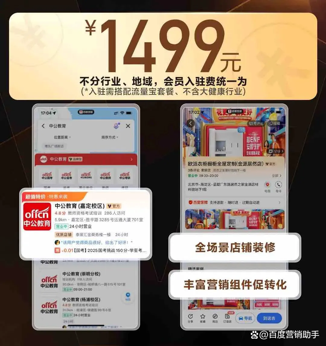 为降低商家入驻成本,本次升级将各行业、地域会员入驻费用统一调整为1499元(需搭配流量宝套餐、不含大健康行业),让更多中小商家有机会在地图场景获取客户。入驻后即可享受全场景装修能力、展示提权、数据报告等会员专属权益。