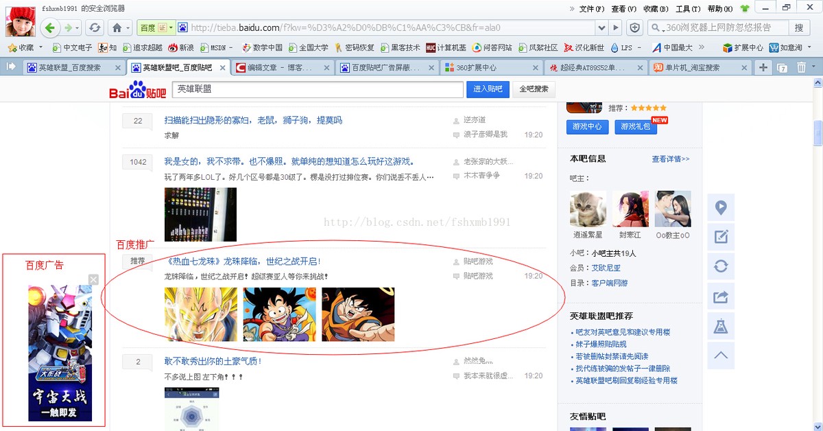 首先打开一个英雄联盟贴吧网址http://tieba.baidu.com/f?kw=%D3%A2%D0%DB%C1%AA%C3%CB&fr=ala0 可以看到里面好多广告