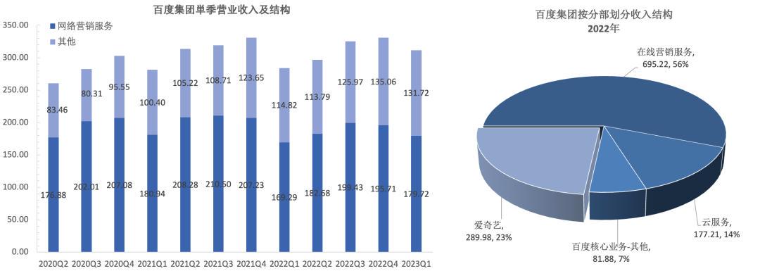 百度财报同时披露两个口径的业务结构,原始口径下公司收入分为广告业务和非广告业务(其他),23Q1广告业务收入占比57.71%。业务分部口径则主要包括百度核心和爱奇艺,其中百度核心中的广告收入占比约56%,这即说明爱奇艺的广告业务对公司整体的贡献相对较小,百度自身的广告业务不仅是公司的收入支柱,也是Q1实现收入超预期增长的核心动力。