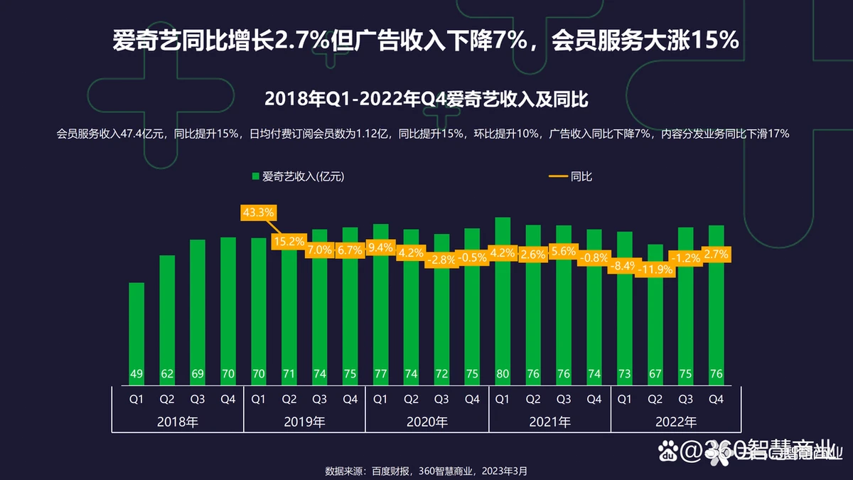 • 爱奇艺同比增长2.7%但广告收入下降7%,会员服务大涨15%