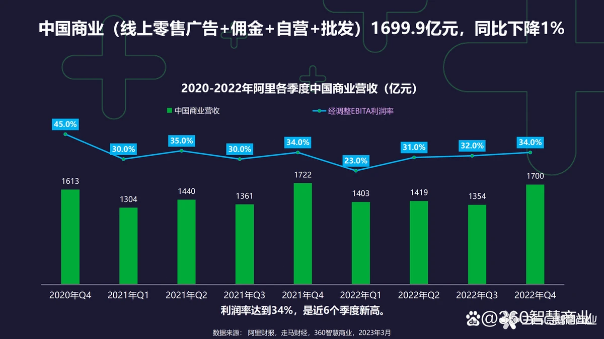 • 中国商业(线上零售广告+佣金+自营+批发)1699.9亿元,同比下降1%