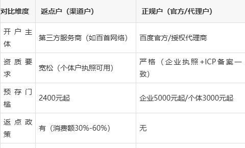 以下是2025年 百度返点户(渠道户)与正规户(官方/代理户)的核心区别 对比,基于最新政策整理为 7维决策指南,帮助您精准匹配需求: