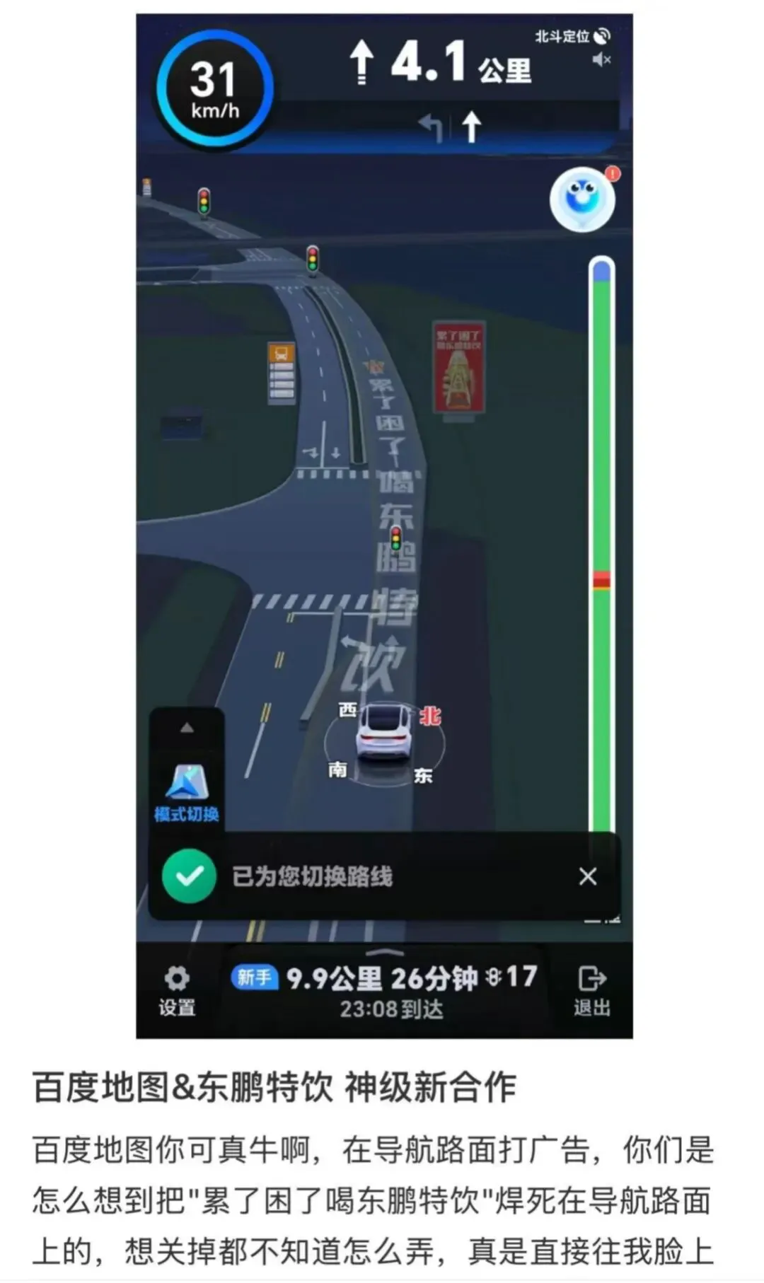 从用户配图看,用百度地图导航的界面中,在导航的路线图地面上出现了“累了、困了、喝东鹏特饮。”的广告,想关掉都没办法关掉。