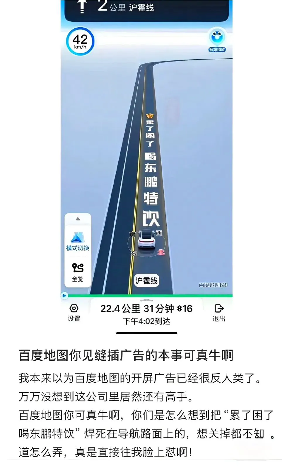 近日有车主晒出了用百度地图导航时出现的广告,用户发帖称:“我本来以为百度地图开屏广告已很反人类的,万万没想到这公司里居然还有高手。”