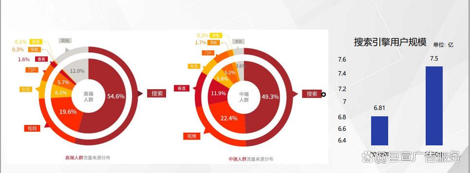 中国互联网络信息中心( CNNIC ) 数据显示, 截止2020年3月我国搜索引擎用户规模达到7.5亿, 使用率83%;搜索引擎是网民除即时通信外使用率最高的互联网应用, 作为基础应用, 搜索引擎用户规模随着网民规模的扩大而持续增加。