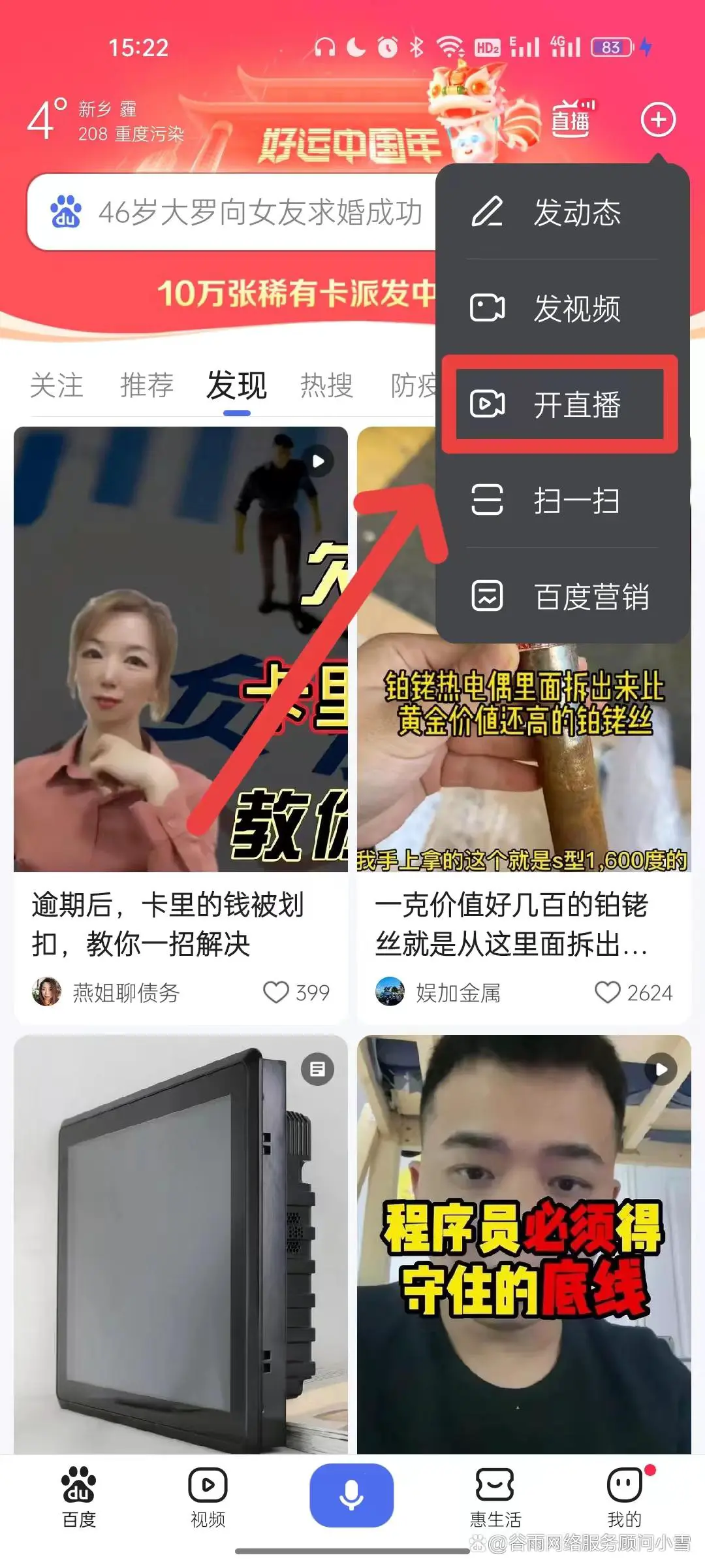 这个是在百度百家号APP开直播的方法,这两个方法都是可以的,建议使用百家号,因为在百家号上开直播,是同步到百度上的,用户可以在百度上看到您的直播。