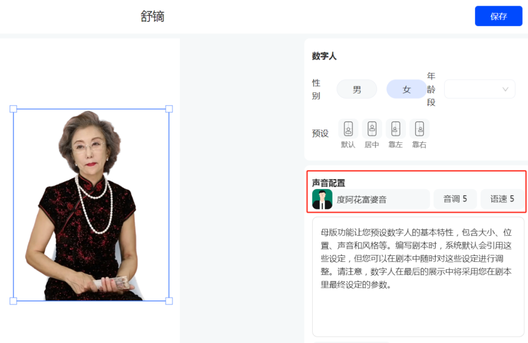 在基础配置上,平台提供了性别,年龄,数字人所处画面位置等选项。其中,更引起我们注意的是声音配置功能。